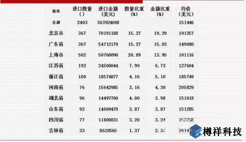 其中:美***是進口數量***多、進口金額******的******(進口1006臺、11193.00萬美元,均價111262美元),新加坡的進口數量和進口金額均列第二(進口580臺、9992.04萬美元,均價172276美元);上海市的進口數量***多(進口502臺、同比上升30.73%,均價101116美元),北京市的進口金額******(進口7019.12萬美元、同比上升54.90%,均價191257美元)。