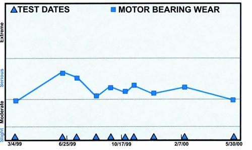 嚴重程度評分的趨勢是機器健康狀況的良好指標。對于每個診斷規則模板,嚴重性分數將映射到嚴重性等級,包括輕微,中度,嚴重和極端。用于確定嚴重性的算法是基于由振動專***手動分析的大量測試結果針對每個診斷憑經驗導出的。如果軸承磨損的指示(軸承音,諧波,邊帶和本底噪聲)隨著時間的推移而增加,專***系統將認識到這一事實,并且分配給軸承磨損診斷的嚴重性將增加。在趨勢圖(圖7)中,電機軸承磨損故障嚴重程度已經趨于平穩。
