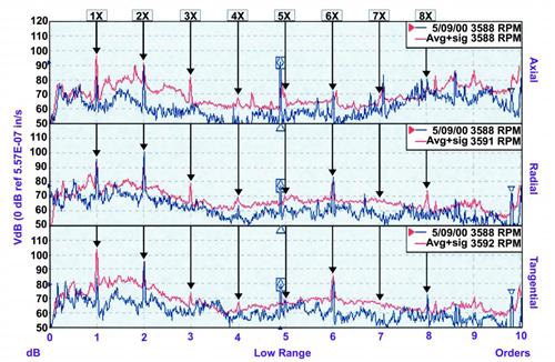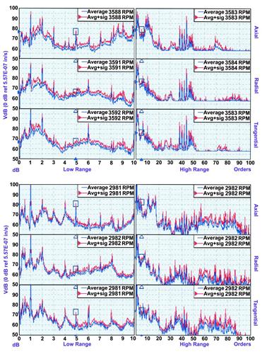 然后,計算平均加一西格瑪光譜掩模。據統計,大約85%的振動幅度應低于平均值加上一個西格瑪面罩。與供應商定義的通過/未通過標準或絕對標準(如IRD圖表)不同,相對標準允許機器本身定義可接受的內容。圖3是在該案例歷史中使用的相對接受標準的一個軸的示例。圖4顯示了低和***范圍數據的所有三個軸的平均和平均加西格瑪水平。如果800線譜中的一個或多個峰超過平均加西格瑪振幅標準,則僅這一事實并不表示存在嚴重問題(參見診斷策略部分)。