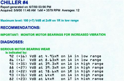 用于識別故障及其嚴重性的專***系統邏輯是作為經驗過程的一部分創建的,其中將大量機器上的自動診斷與振動專***在那些相同機器上進行的診斷進行比較。因此,專***邏輯規則反映了振動專***如何分析數據。因此,專***系統并不比創建它的振動分析師更好。由于前一段中概述的所有步驟都是常規和重復的,因此現代計算機可以在幾臺秒內快速執行所有四個分析步驟。然后專***系統為冷卻器電機軸承磨損生成基于文本的報告,如圖5所示。